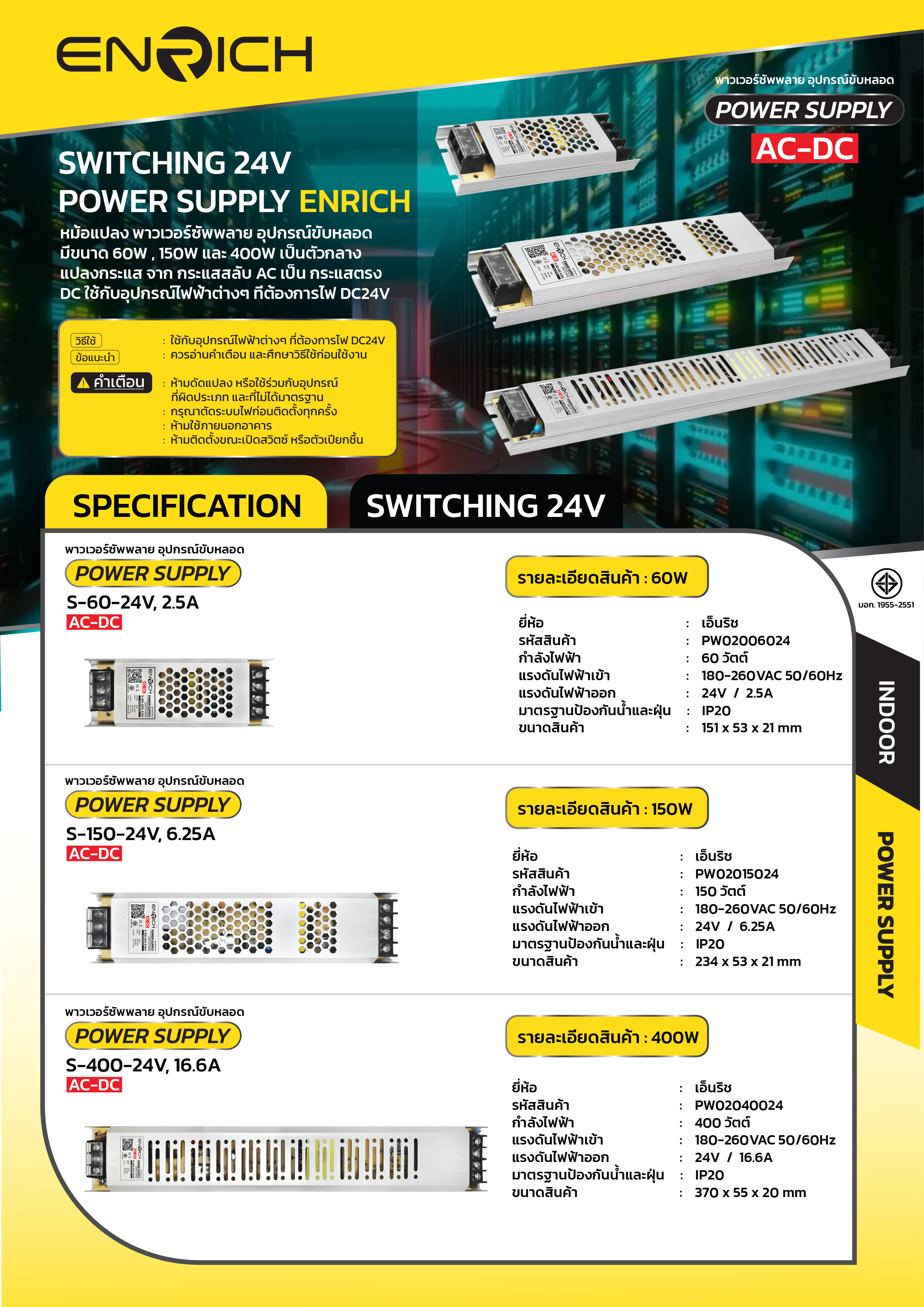 สวิทช์ชิ่ง พาวเวอร์ซัพพลาย ENRICH S-150-24V 6.25A 150Wสวิทช์ชิ่ง พาวเวอร์ซัพพลาย ENRICH S-150-24V 6.25A 150W SWITCHING 24V POWER SUPPLY ENRICH หม้อแปลง พาวเวอร์ซัพพลาย อุปกรณ์ขับหลอด มีขนาด 60W , 150W และ 400W เป็นตัวกลาง แปลงกระแส จาก กระแสสลับ AC เป็น กระแสตรง DC ใช้กับอุปกรณ์ไฟฟ้าต่างๆ ที่ต้องการไฟ DC224V ใช้สำหรับจ่ายพลังงานให้กับอุปกรณ์ต่างๆ ที่ต้องการไฟฟ้ากระแสตรงที่เสถียรและแรงดันที่เหมาะสม มีการป้องกันไฟฟ้าลัดวงจรและการโหลดเกิน ช่วยให้ใช้งานได้ปลอดภัย นิยมใช้ในงานอุตสาหกรรมและอุปกรณ์อิเล็กทรอนิกส์ต่างๆ ดูรายละเอียดสินค้า >>คลิ๊ก<<